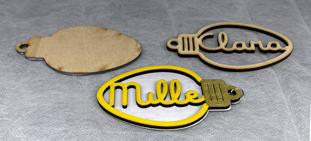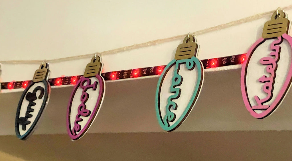 This is a multi-layer bulb ornament design, perfect for personalizing with family names, quotes, or holiday greetings. Each bulb is laser-cut ready for you to decorate