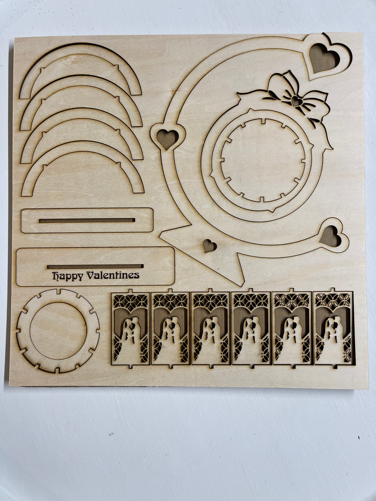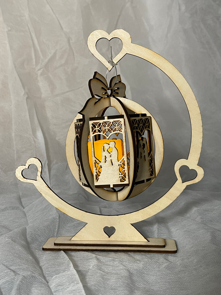 A unique, intricately, detailed hanging lantern featuring a valentine couple. Laser cut made out of wood. This one takes some patience to align and assemble all the pieces, but a fun challenge!