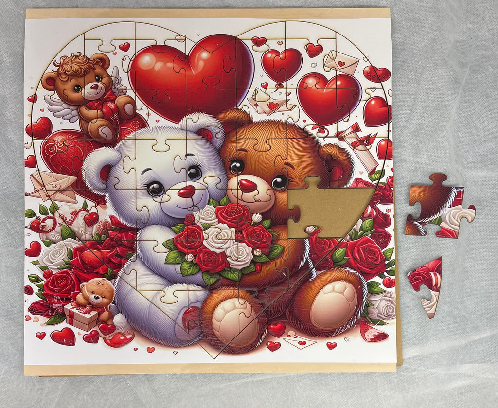 A jigsaw puzzle with a cute Teddy bear valentine's day scene cut into a heart shape. The puzzle is wood backed with a laminated vinyl top.