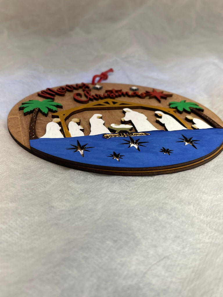 A simple nativity scene ornament with two layers to give some depth. At 7 inches in diameter, it is a large ornament or wall hanging. It will ship with the pieces cut but unassembled and unpainted so that you can decorate to make it your own.