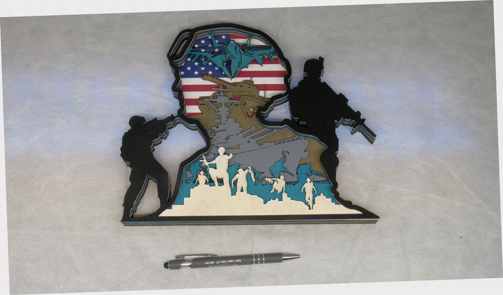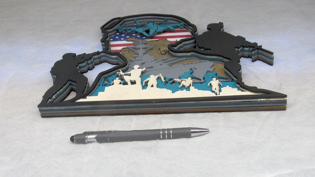 This intricate, multi-layered design is shaped like a soldier’s helmet and profile, with the internal layers featuring a patriotic montage of the U.S. Flag, a jet fighter, a tank, a naval ship, and soldiers in action. This project is designed for easy assembly, creating a striking, patriotic shadow box effect that is a perfect, meaningful tribute for a military member, veteran, or fallen soldier.