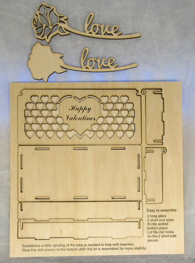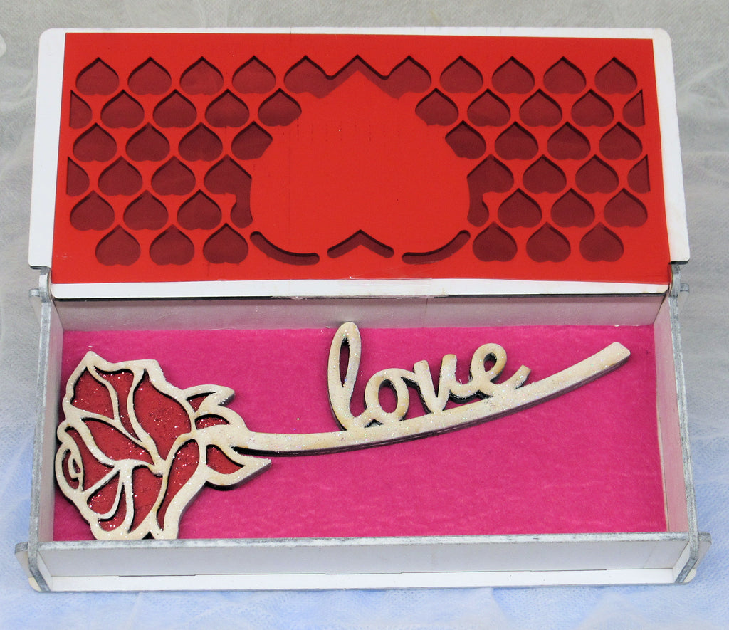 A unique wooden laser cut box for your Valentine, featuring a Beautifully cut 3d rose inside.